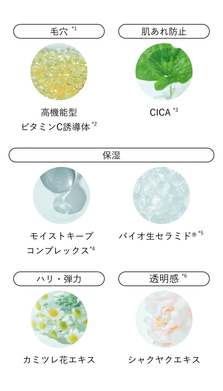 *1 乾燥による目立つ毛穴/*2 パルミチン酸アスコルビルリン酸3Na/*3 ツボクサ葉・茎エキス/*4 異性化糖, ジラウロイルグルタミン酸リシンNa, ポリクオタニウムー51/*5 スフィンゴ糖脂質/*6 肌がうるおってキメが整った印象