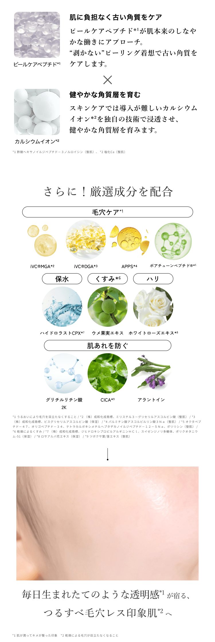 ピールケアペプチド*4が塗るだけで古い角質をやさしくケア!「つるん」と毛穴レス印象*5の肌へ導きます。