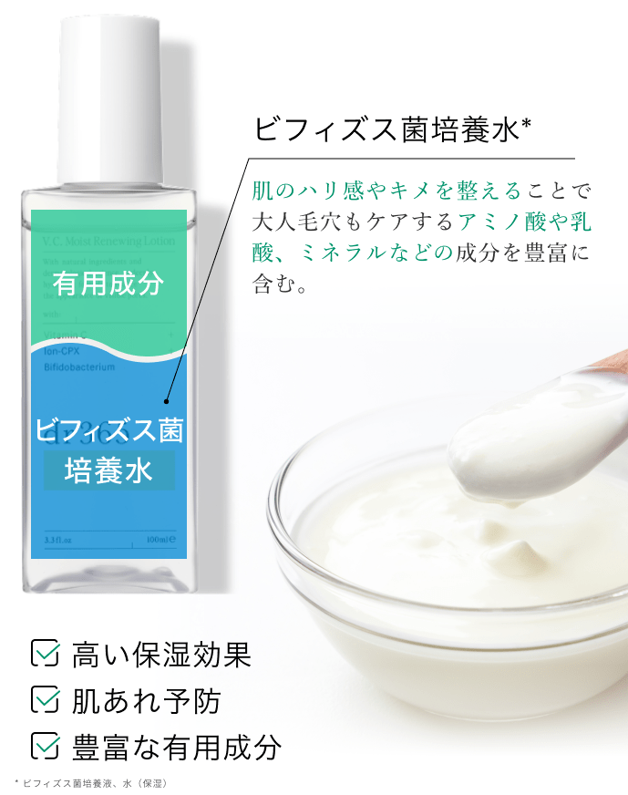 02: ビフィズス菌培養水*を、化粧水の主原料に。