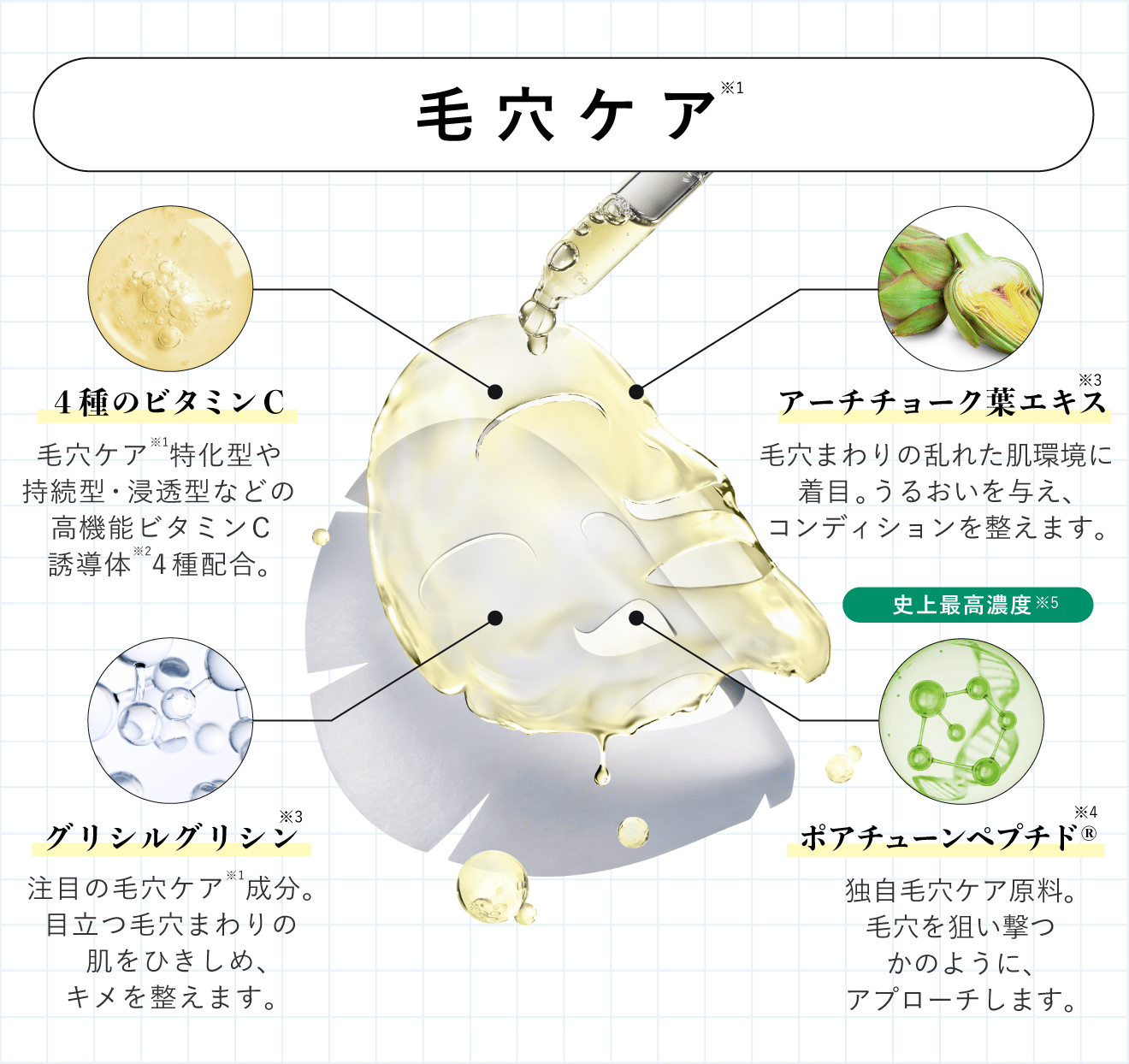 4種のビタミン*1やアーチチョーク葉エキス*2、グリシルグリシン*3をはじめ、独自毛穴ケア成分「ポアチューンペプチド*4」を史上最高濃度*5で処方しました。