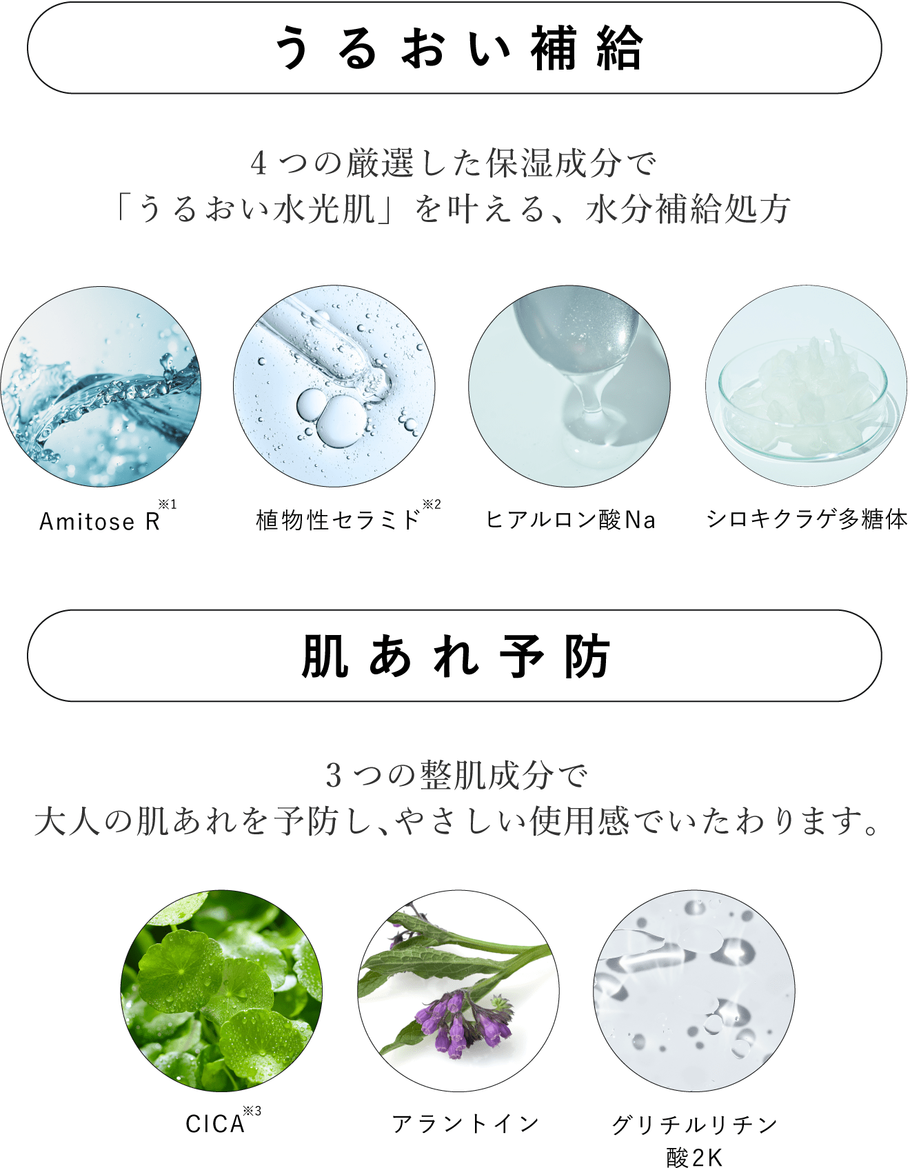 その他、AmitoseR*6、植物性セラミド*7、シロキクラゲ多糖体*8、をはじめ、CICA*9配合で、つるんと透明感*10のある肌へと導きます。