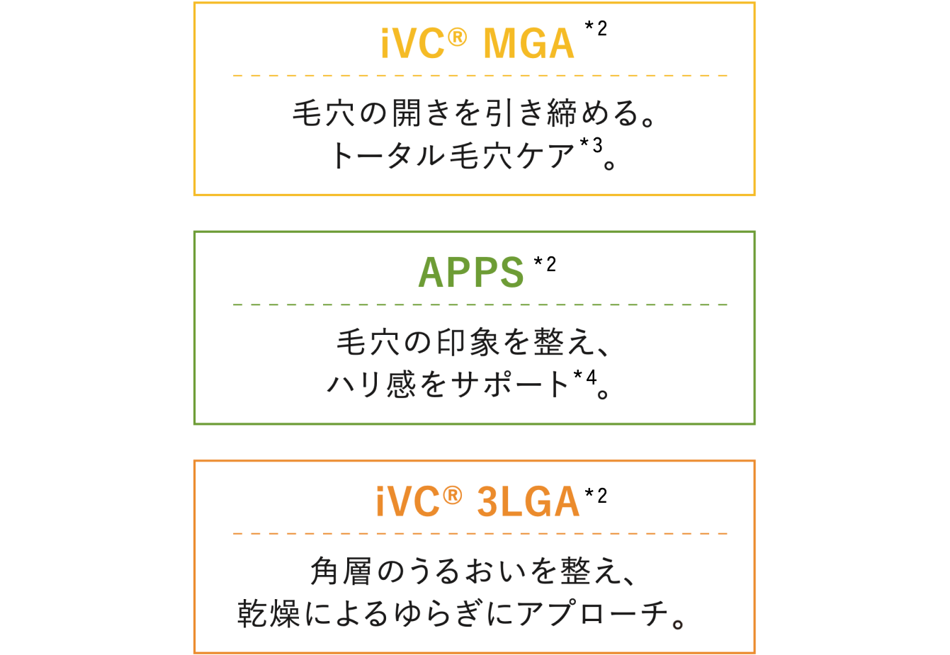 *1 肌と毛穴の年齢のこと/*2 APPS(パルミチン酸アスコルビルリン酸3Na(整肌))、iVC®︎MGA(ミリスチル3-グリセリルアスコルビン酸(整肌))、iVC®︎3LGA(3-ラウリルグリセリルアスコルビン酸(整肌))/*3 うるおいにより毛穴を目立たなくすること/*4 保湿による