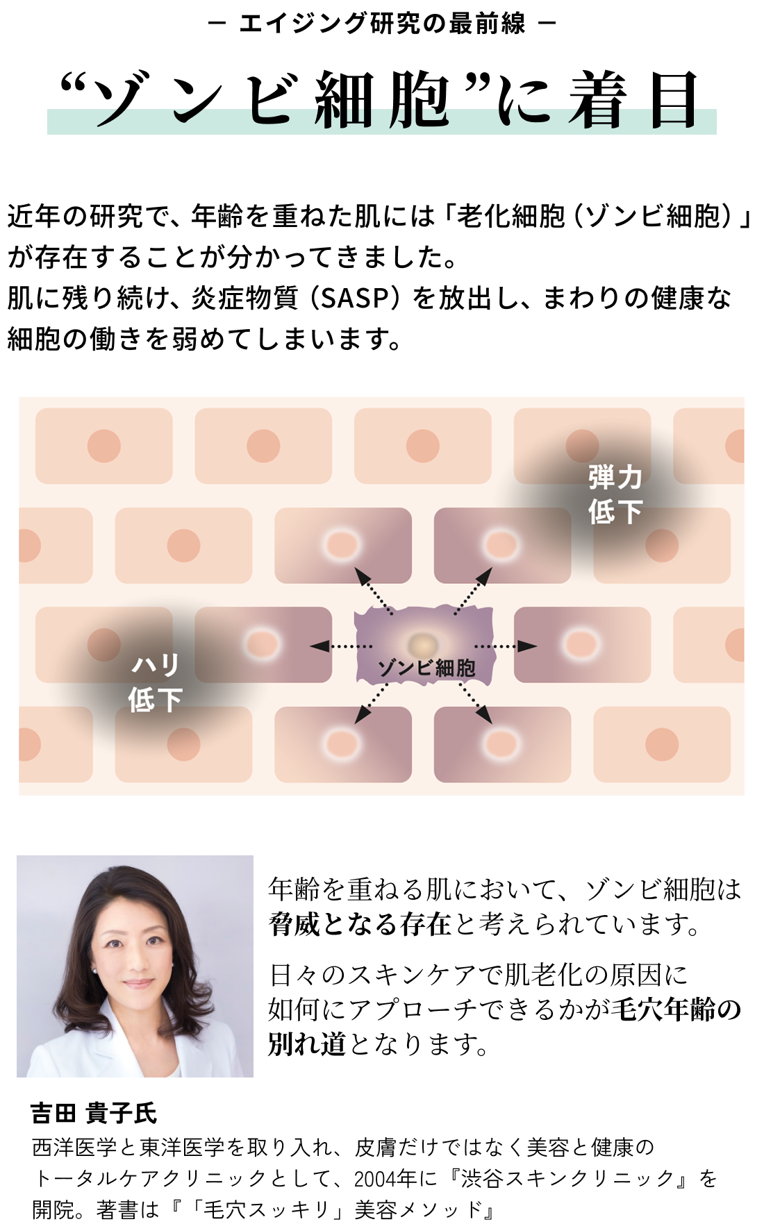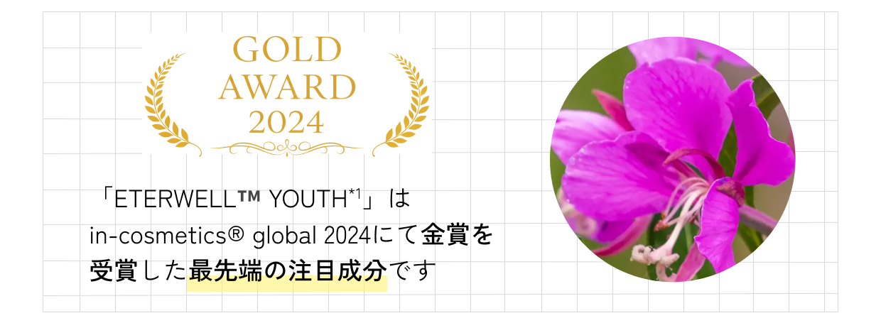 年齢とともに変化する肌環境に着目し、ゾンビ細胞だけを識別し作用することが研究段階で確認されている革新的なアプローチ原料「ETERWELL™ YOUTH*1」。キメの密度感*2が低下した肌をすこやかに整え、ふっくらとしたハリのある印象へ。
