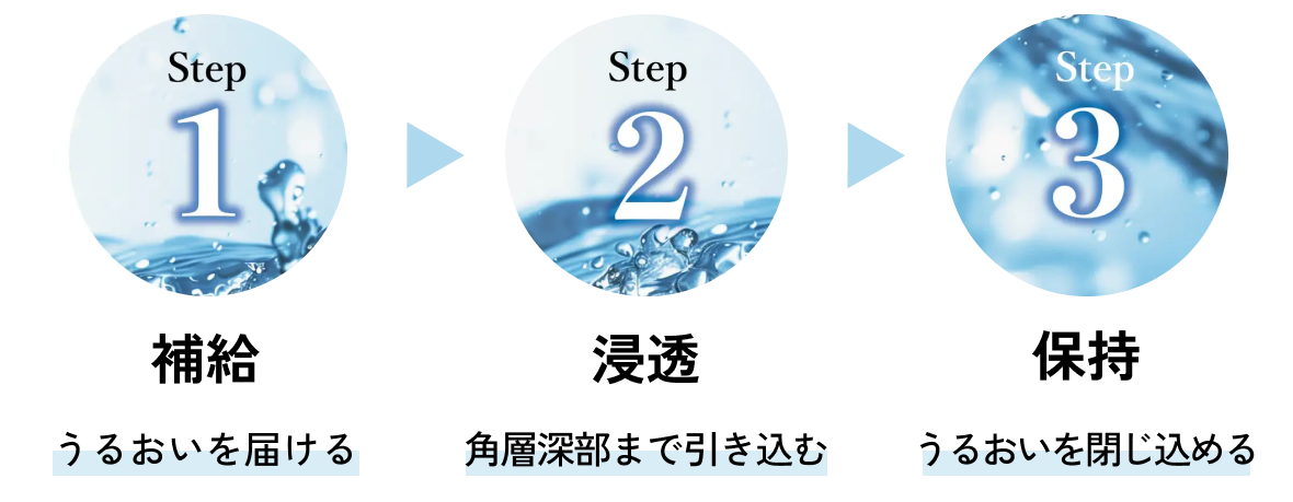 エイジングによってうるおいが失われやすい肌を多層的にサポートするため、保湿成分の浸透経路と保持機能に着目した3ステップ処方を採用しました。