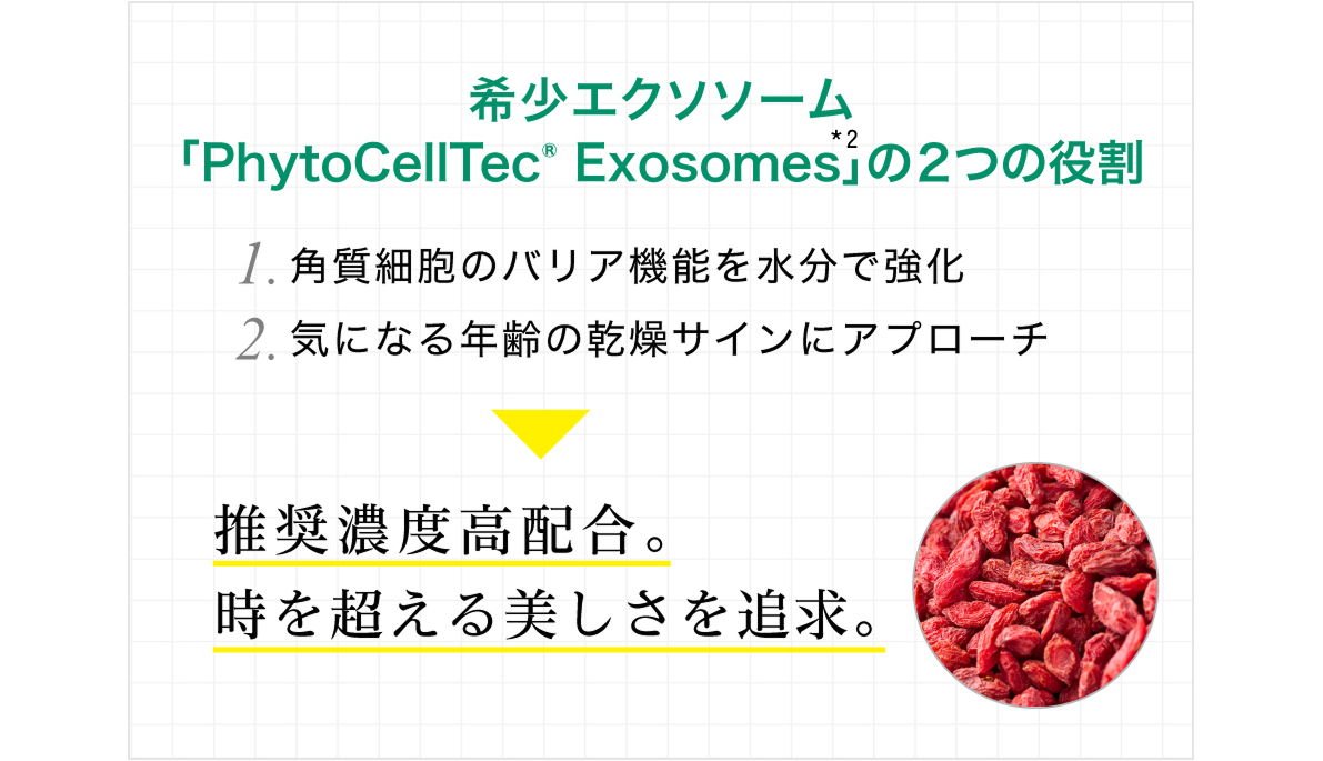 長寿をもたらすスーパーフルーツとして知られる「クコの実」から抽出した、エイジングケア*1機能に優れる植物幹細胞「PhytoCellTec® Exosomes*2」を配合。